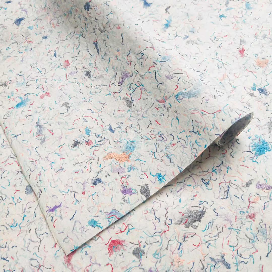 Close-up of Kozo Studio mulberry paper infused with chunks of colorful cotton, demonstrating its vibrant design and hand-crafted nature.