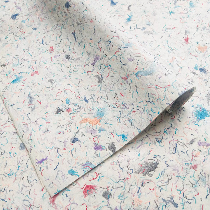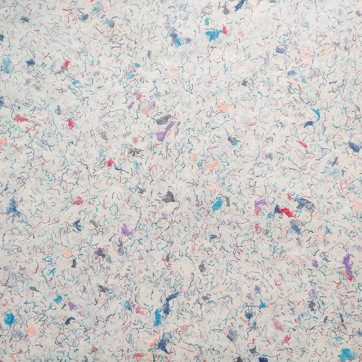 • This is a unique type of mulberry paper made from kozo pulp infused with colorful cotton pieces. The paper is medium weight, and it has a mellow and vibrant feel. It's perfect for various types of fun art and craft projects. Friendly warning: you might encounter some challenges when cutting or folding the paper in areas where there are larger chunks of cotton.