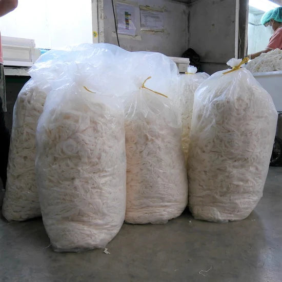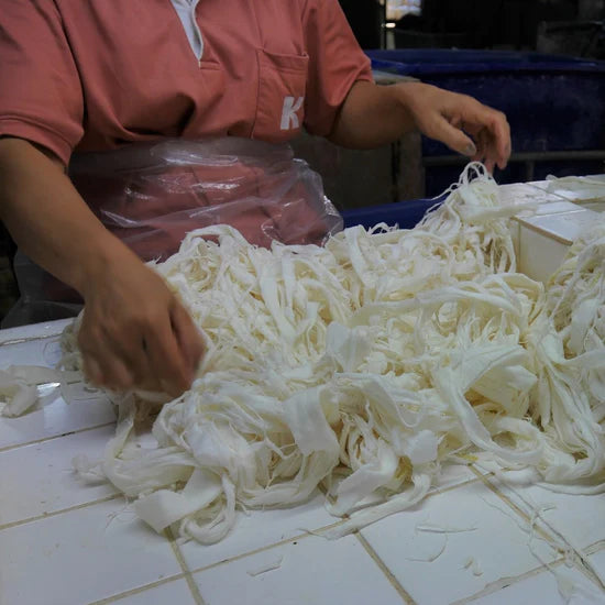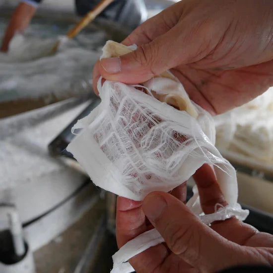 When it's time to make the papers, the kozo tissues are beaten until they become a fine pulp. This pulp is ready to be used for crafting beautiful kozo papers.